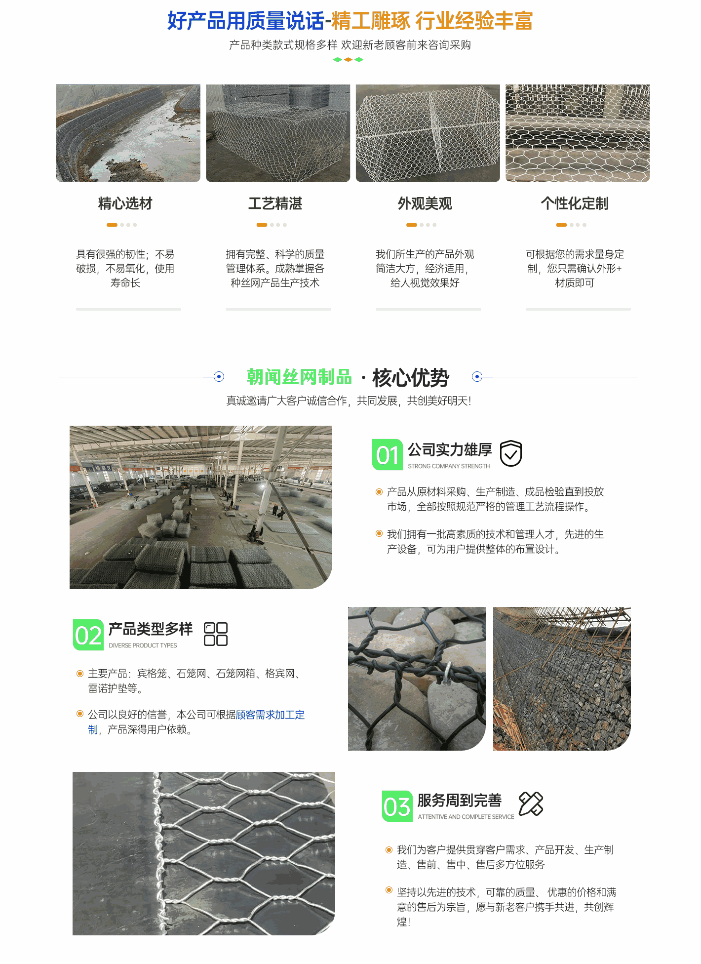 深州市朝聞絲網(wǎng)制品有限公司擁有“中國絲網(wǎng)之鄉(xiāng)”美譽的河北省致力于生產(chǎn)銷售格賓網(wǎng),雷諾護(hù)墊,景觀石籠網(wǎng),邊坡防護(hù)網(wǎng),綠濱墊,固濱籠的廠家,規(guī)格多種多樣?! ∥覐S堅持技術(shù)創(chuàng)新、科學(xué)管理、誠信經(jīng)營,注重引進(jìn)新型生產(chǎn)技術(shù)設(shè)備,推行標(biāo)準(zhǔn)化生產(chǎn),采用質(zhì)量管理體系,從原材料采購、生產(chǎn)管理、產(chǎn)品檢測等關(guān)鍵環(huán)節(jié)嚴(yán)格把關(guān),確保了產(chǎn)品質(zhì)量,贏得了客戶的信賴。我公司秉承“誠信、務(wù)實、高效”的企業(yè)宗旨,真誠希望與世界各地客戶互惠互利,共創(chuàng)美好未來!多年來"以誠立廠","以質(zhì)興業(yè)"。 憑借過硬的質(zhì)量、良好的信譽、優(yōu)質(zhì)的服務(wù)、合理的價格不斷拓展市場,誠摯的希望在平等互利,坦誠相待的基礎(chǔ)上與國內(nèi)外客戶長期合作!...